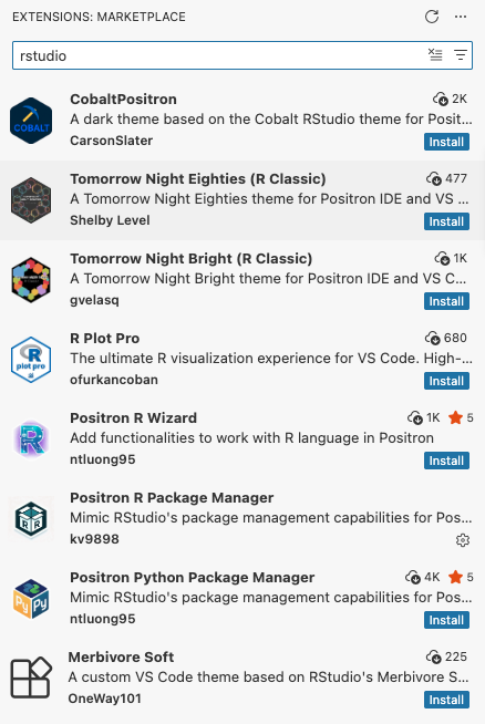 If you’re coming from RStudio and want to keep using familiar shortcuts, install the RStudio Keymap extension in Positron. Open the Extensions panel (View → Extensions), search for “RStudio Keymap,” and click Install. This maps common RStudio shortcuts to their Positron equivalents so you don’t have to retrain your muscle memory.