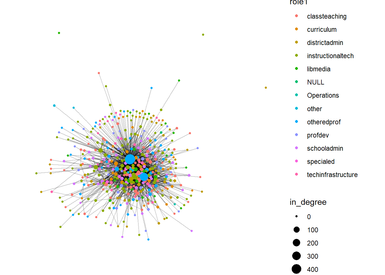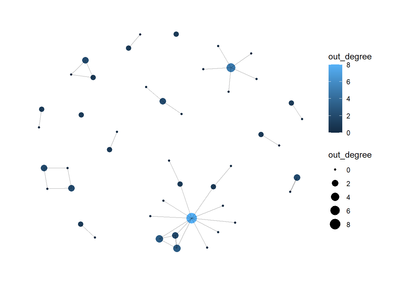 geom_node_point(aes(size = out_degree, color = out_degree)) +