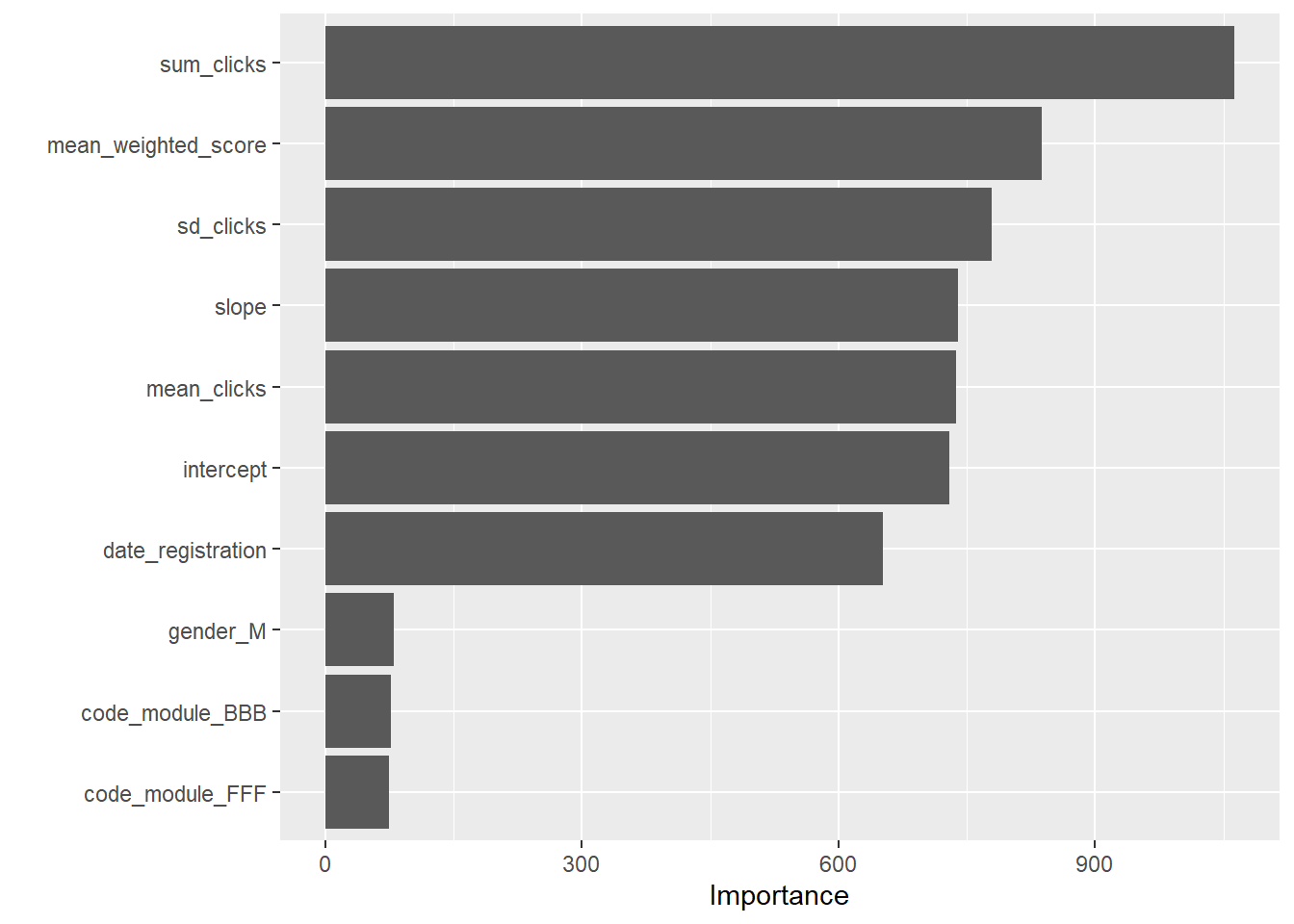 The variable importance analysis underscores that engagement-related features—especially sum_clicks and features capturing the trend in interactions (slope, mean_clicks)—are the most influential predictors. This insight implies that the digital footprint of student engagement in the virtual learning environment is critical for predicting academic outcomes.
