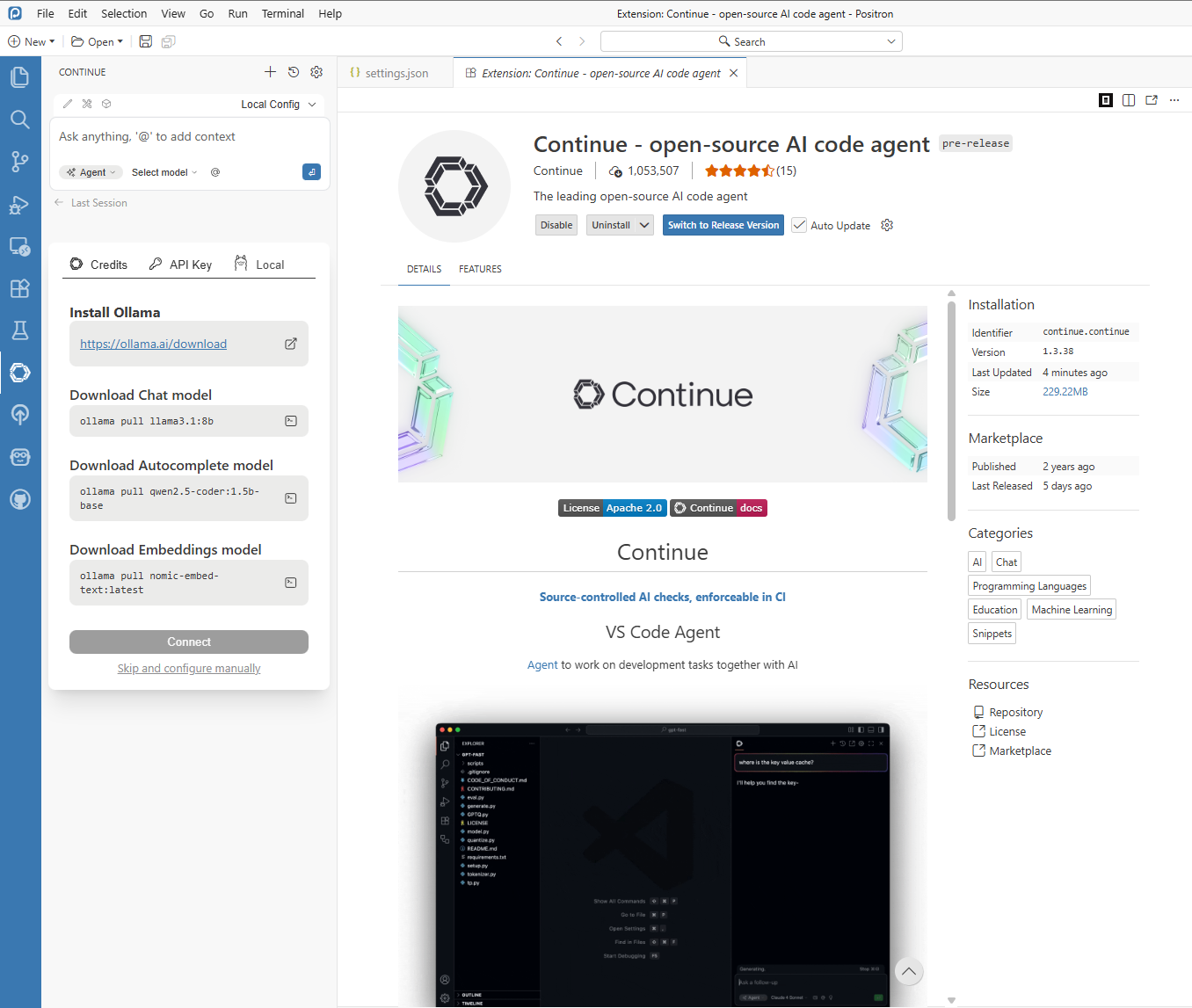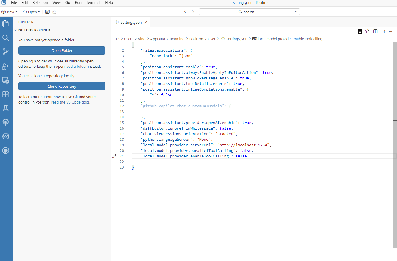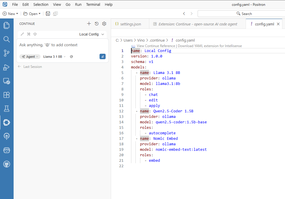 Start in Positron and define local-model JSON settings first.