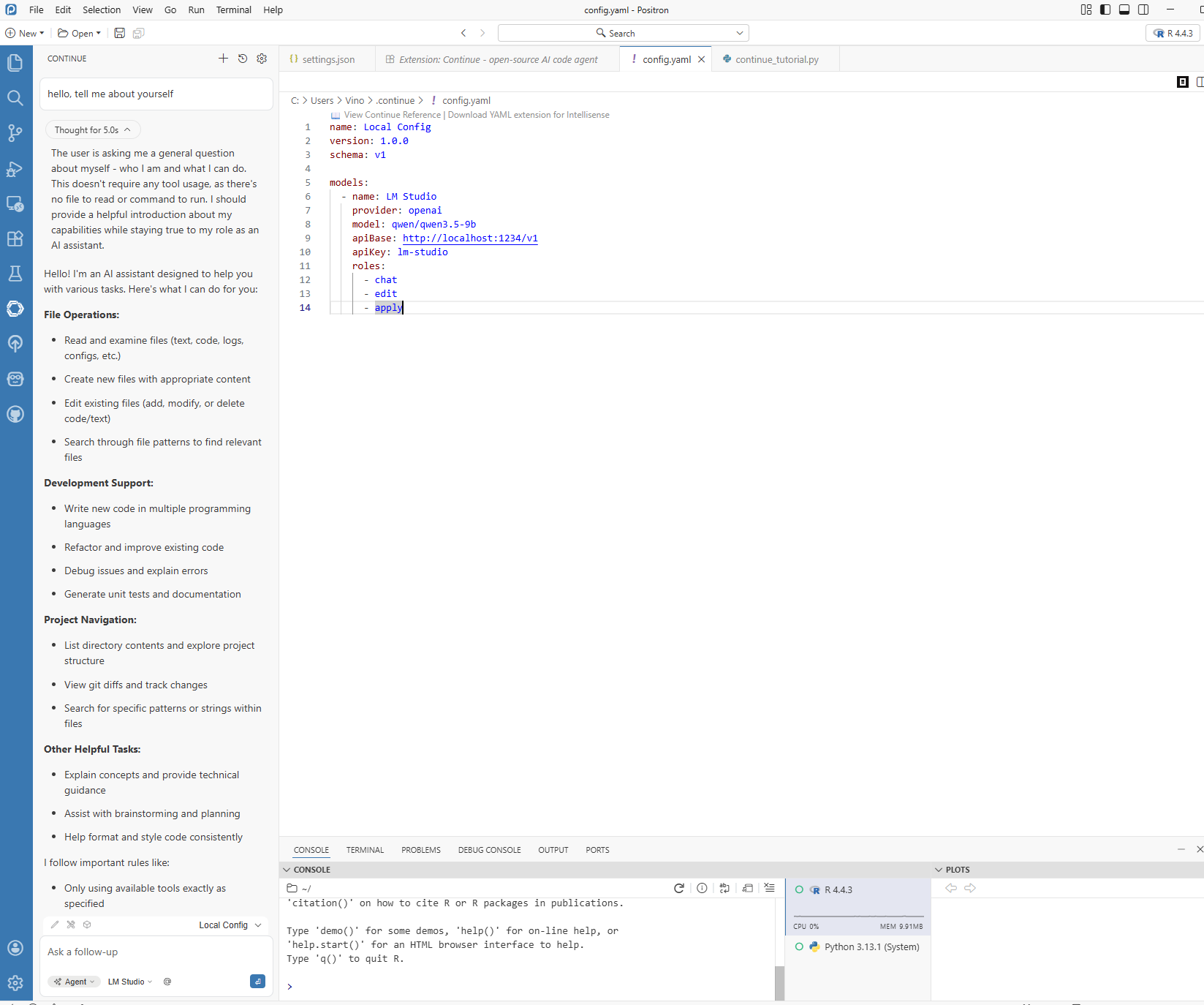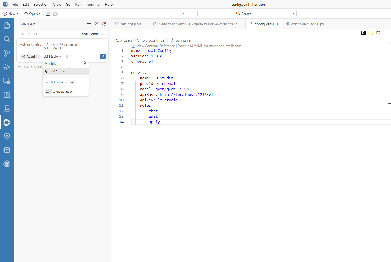If your project requires local execution, you can run an assistant workflow entirely on your own machine by combining Continue in Positron with a local model served from LM Studio. This path is especially useful when your workflow requires tighter data control.