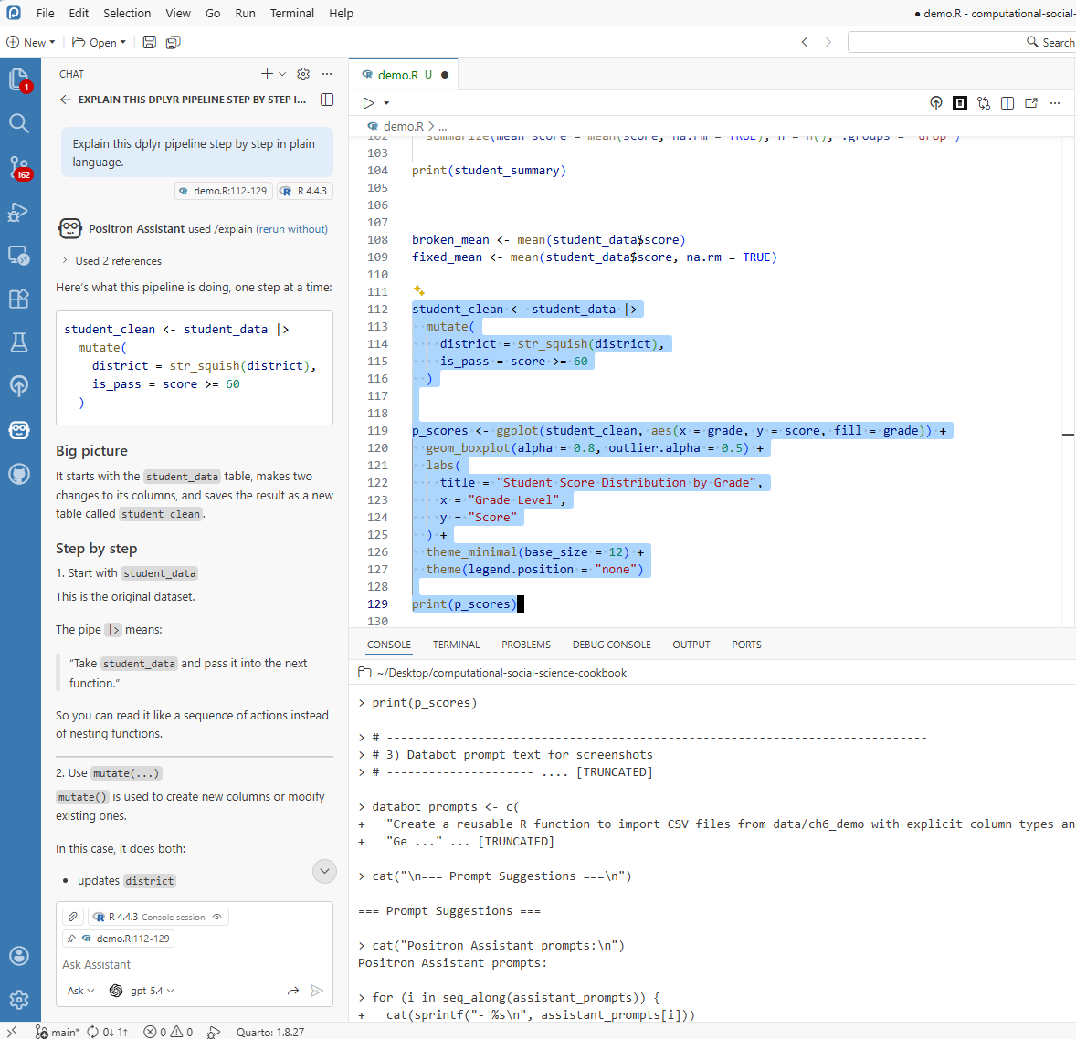 Code Explanation: Ever looked at someone’s code and thought “what on earth is happening here?” Select any block, ask Positron Assistant, and it will translate cryptic code into plain language.