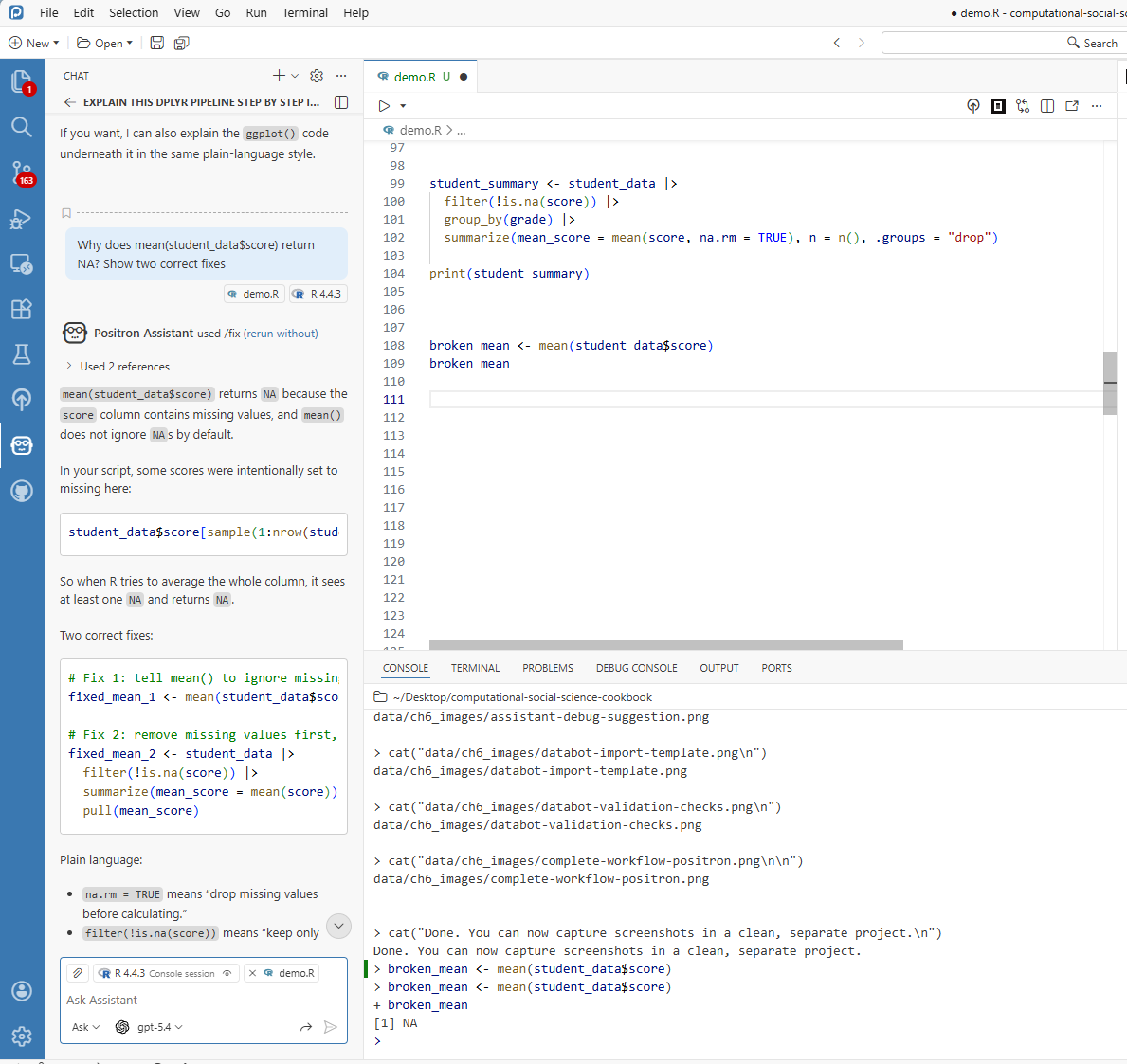 Refactoring: Got messy code that works but is hard to maintain? Positron Assistant can propose cleaner versions and explain the tradeoffs.