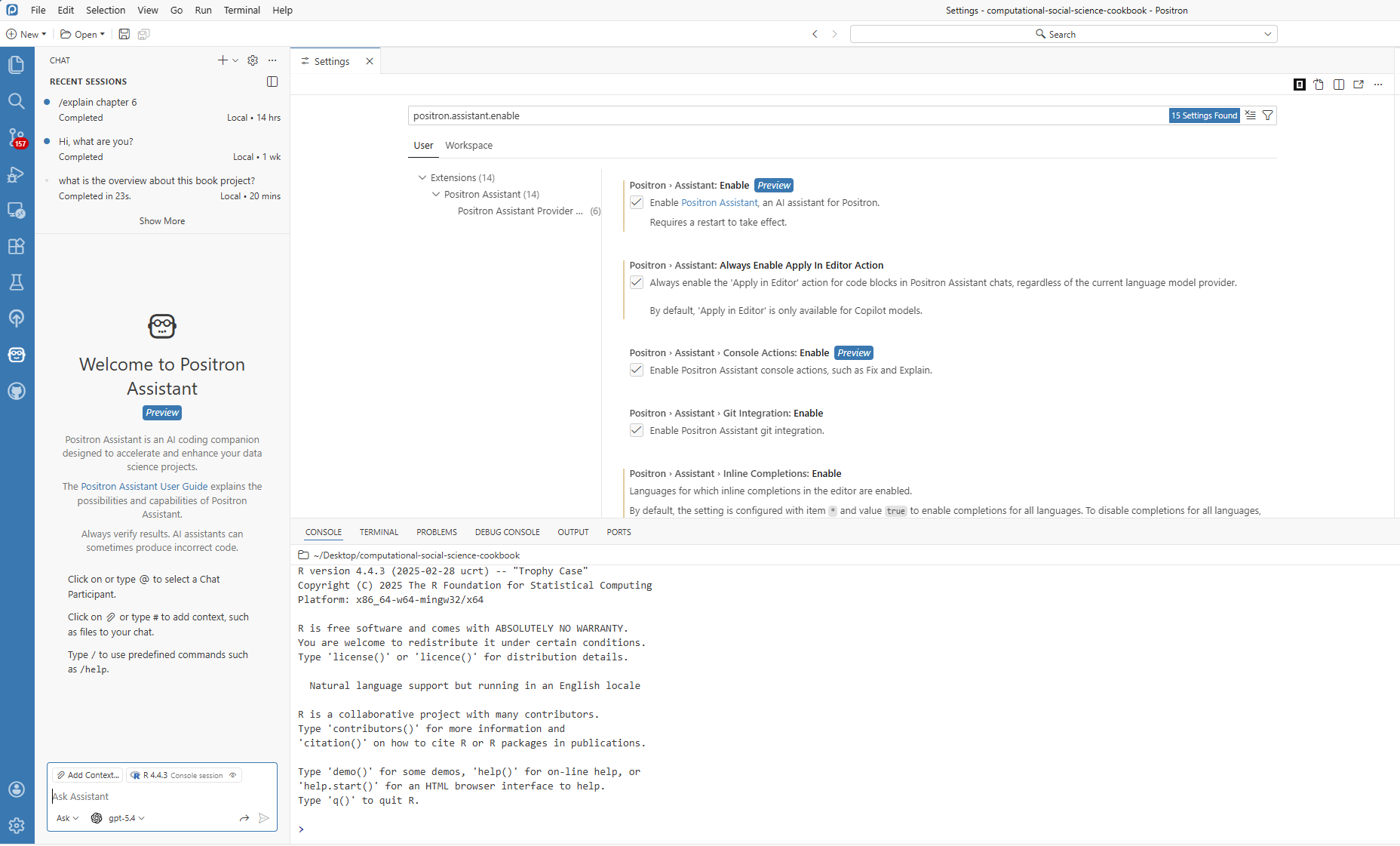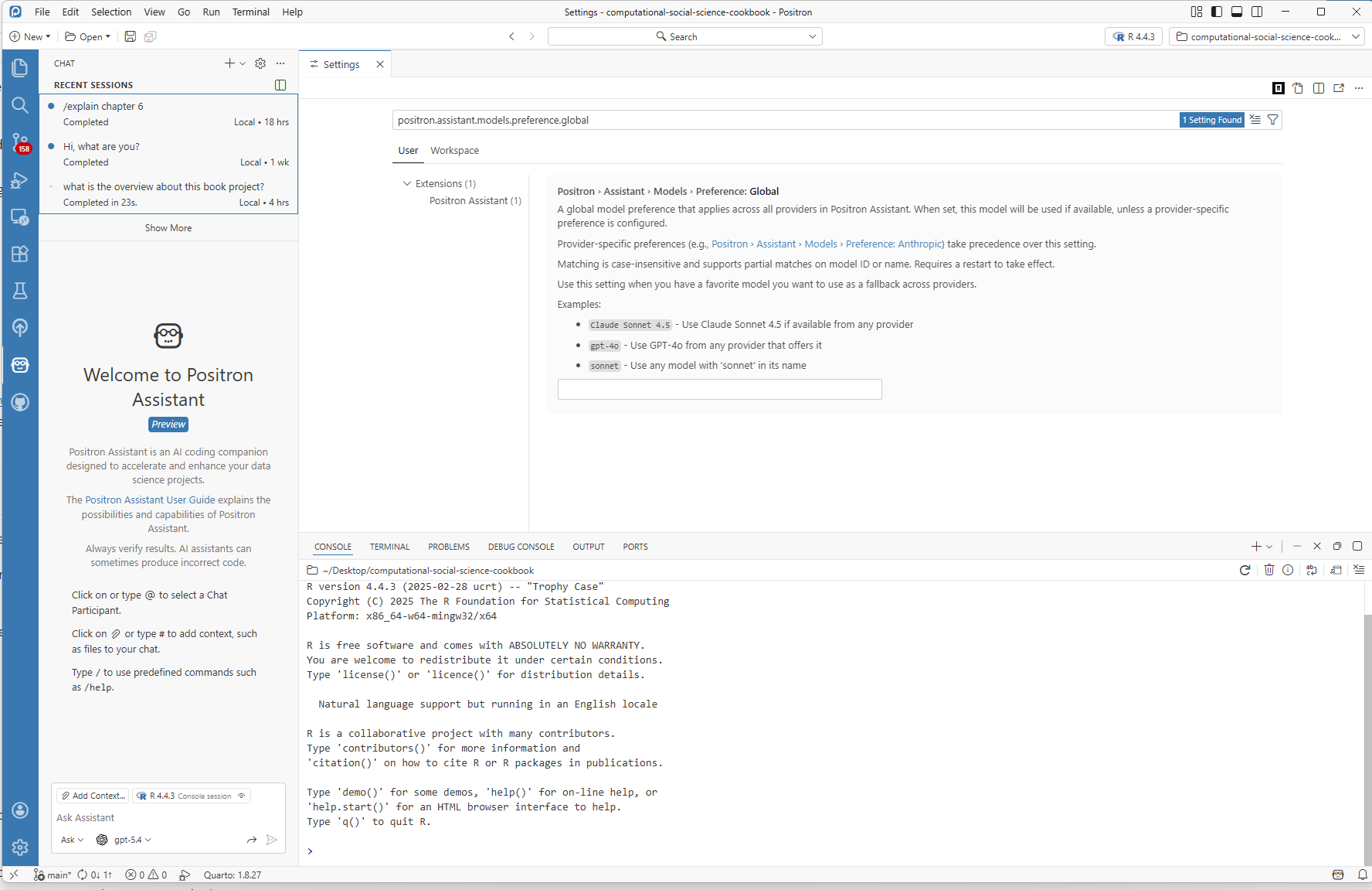 Also remember the privacy boundary: Positron routes requests to your selected provider. Posit documents that it does not store your prompts and AI conversations, but your chosen provider may have its own data retention policy. Review provider terms before using sensitive data.