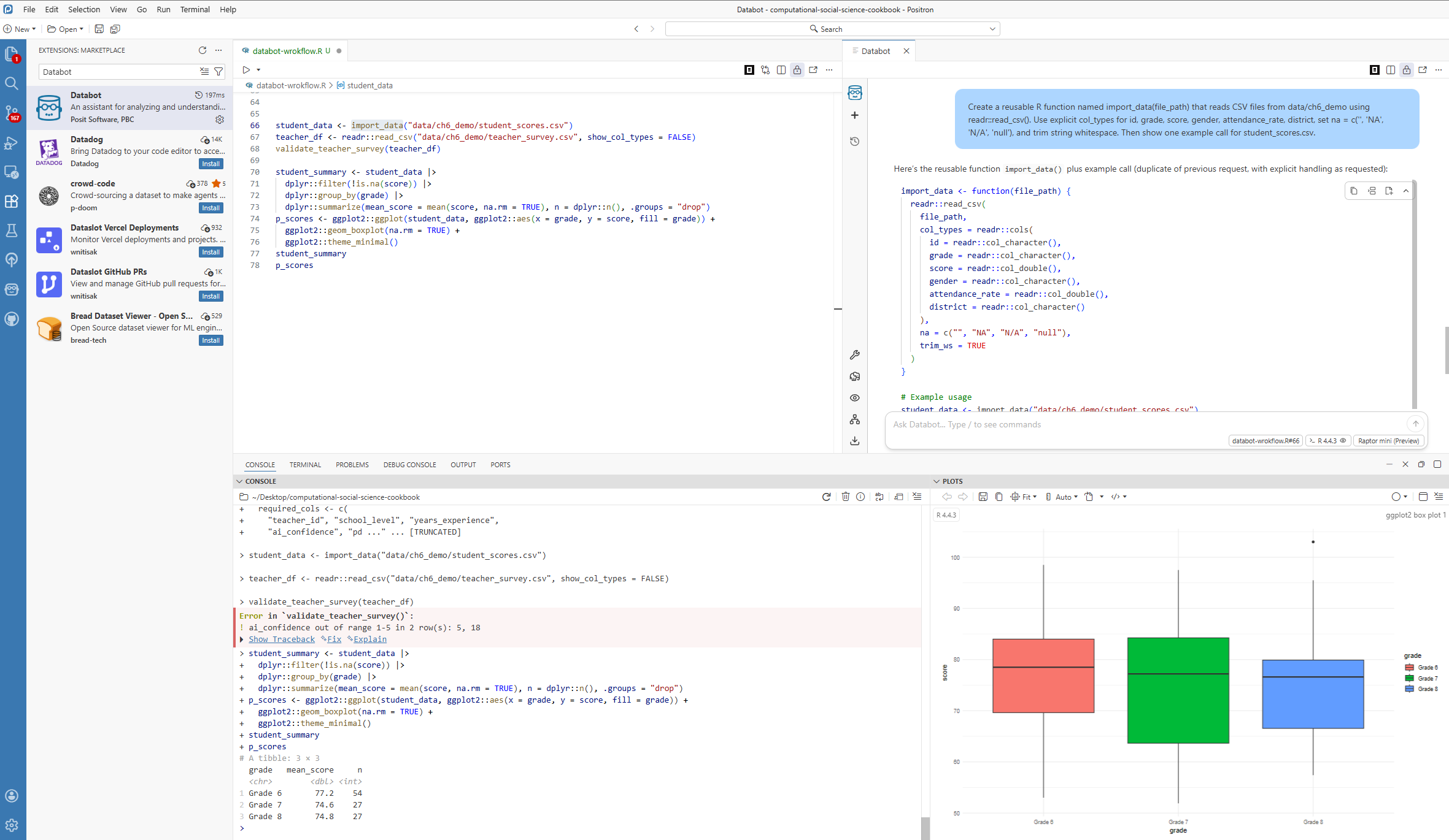 # student_data <- import_data("student_scores.csv")See what happened? You wrote the function once, and now every future data import is one line. Databot helped you think through what you needed once, and now you’re saved from doing it over and over.