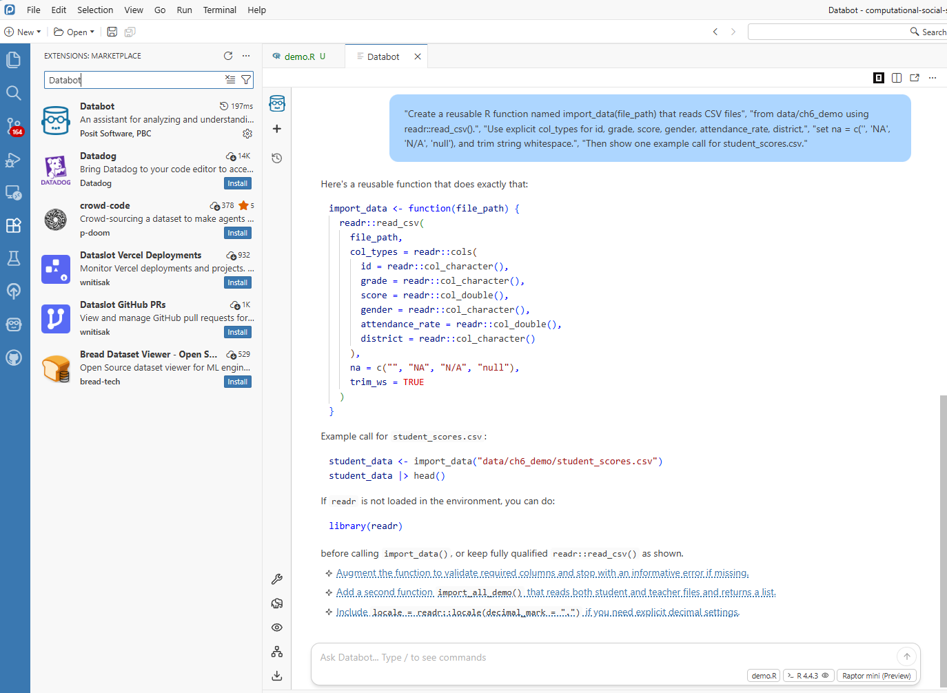 In this chapter, we’re going to meet two helpful teammates: Positron Assistant and Databot. They live in the same ecosystem, but they do different jobs. Positron Assistant is your default coding copilot for chat, inline help, and code suggestions. Databot is an exploratory analysis agent that can accelerate early-stage EDA workflows.