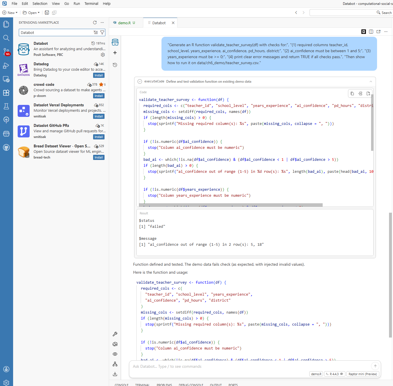 teacher_survey.csv(Section 6.5.3), - use Positron Assistant to refine or explain the generated code,