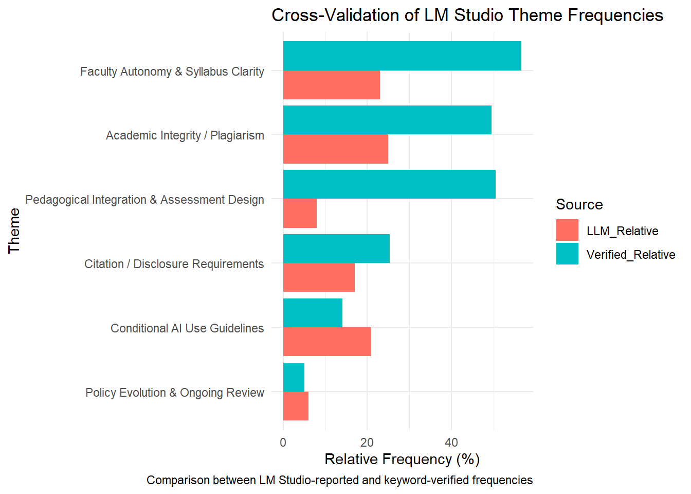c("assignment", "assessment", "learning", "instruction", "pedagog")This set captures a wide range of common words such as learning and assessment, which appear frequently in almost all policy statements. As a result, the keyword-based validation counts nearly half of the corpus as related to pedagogy (≈ 50%), whereas the LM Studio model, which identifies themes only when the semantic context genuinely involves teaching design, reports a much lower frequency (≈ 8%). Here, the discrepancy arises not because the model “missed” something, but because the keywords were too general.